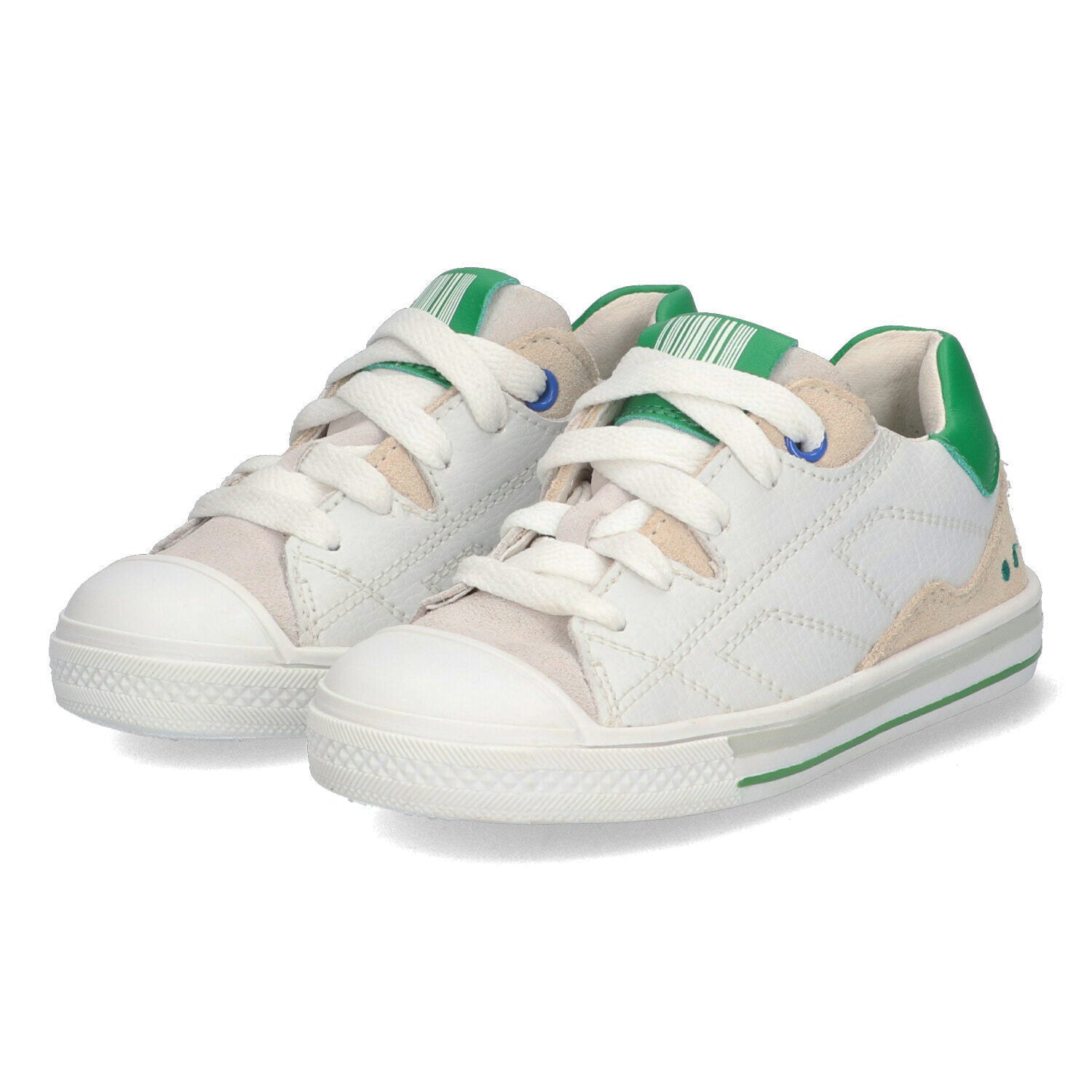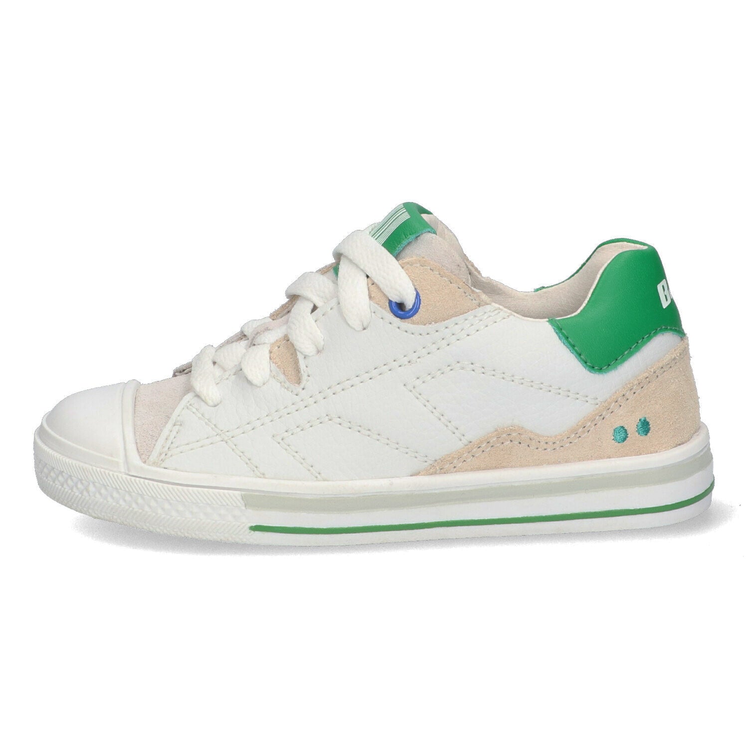 De nubuck kindersneakers zijn Wit, met groene details. Met de veters bevestig je ze stevig aan de voetjes van je (b)engel. Het rubberen neusje en de flexibele rubberen zool zorgen ervoor dat je kleintje zorgeloos op pad kan!