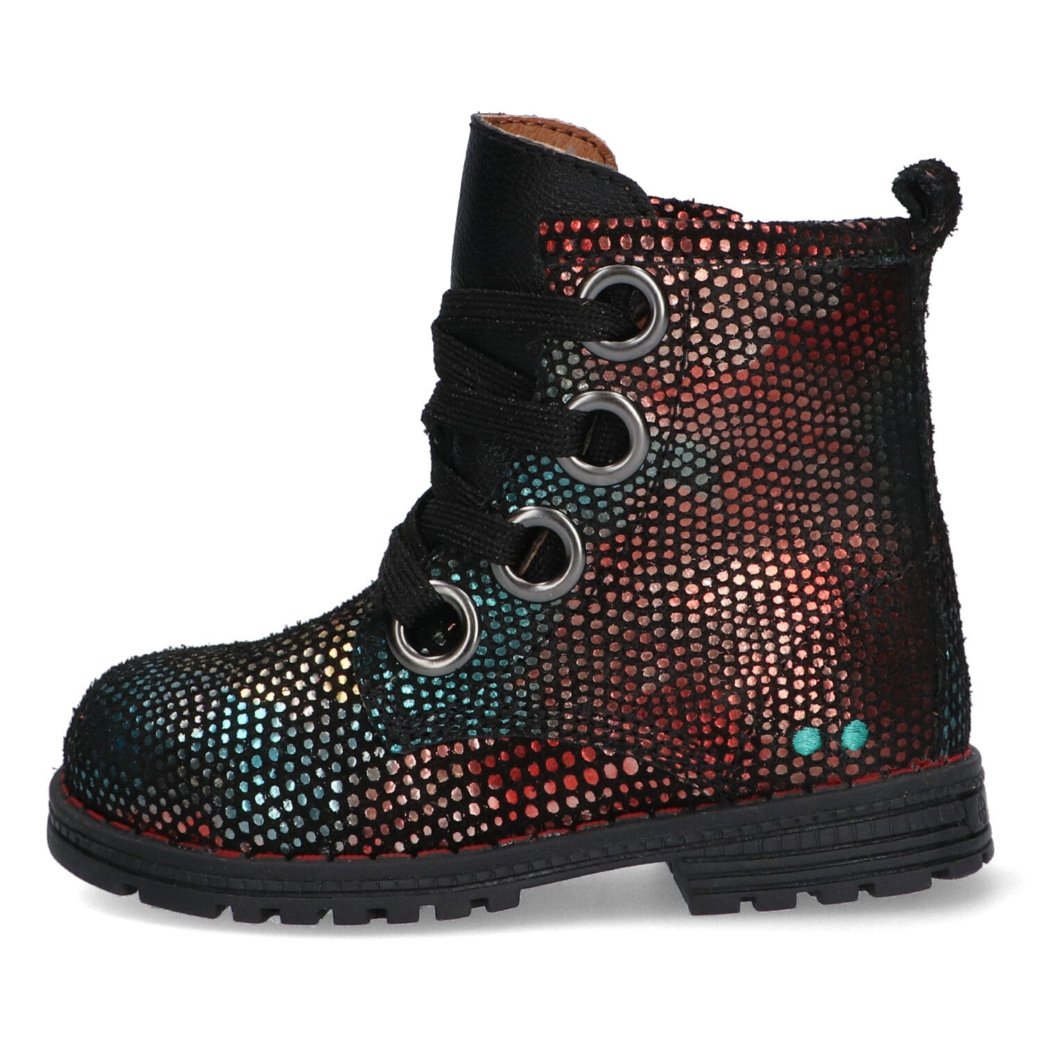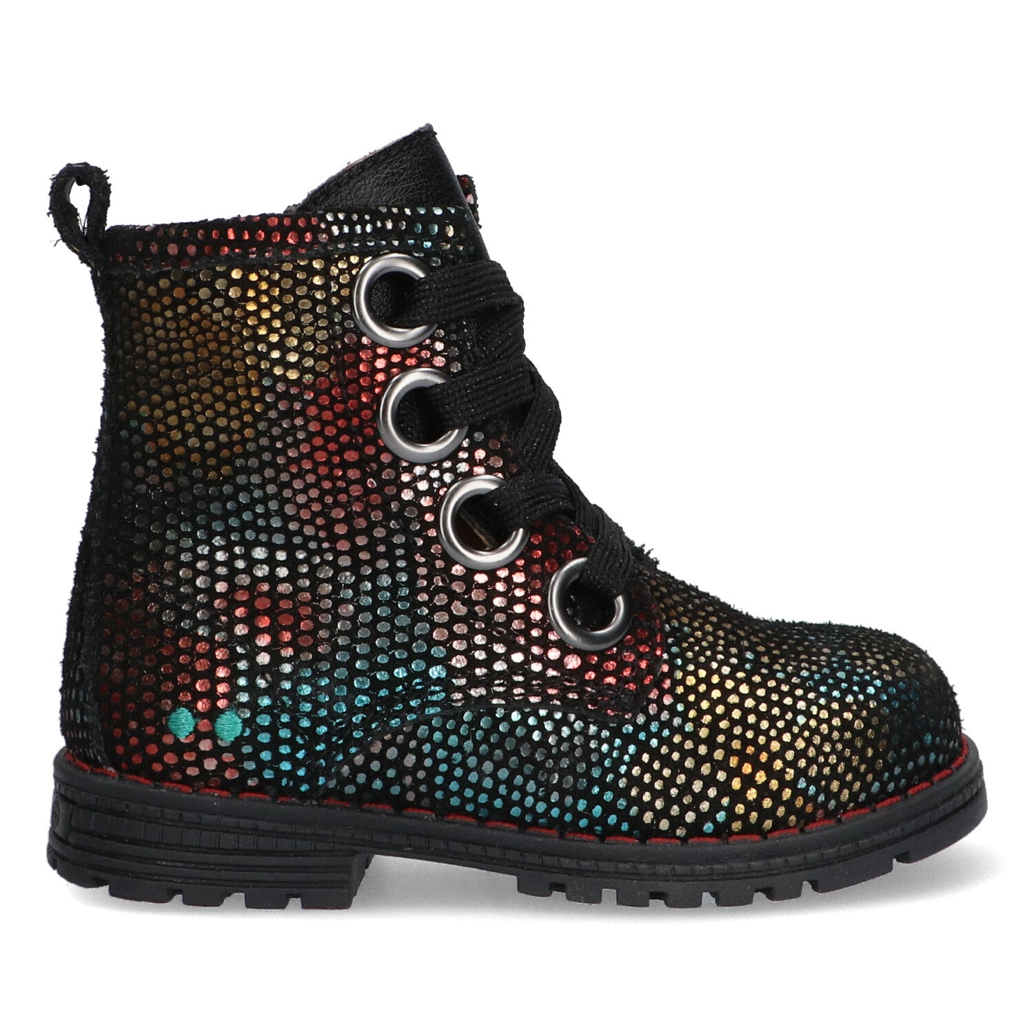 Deze biker boots voor meisjes hebben een opvallende multicolor print met zilveren details. In de zwarte veters zitten glitters verwerkt voor een extra speelse touch. Dankzij de rits aan de zijkant kunnen de laarsjes gemakkelijk aan- en uitgetrokken worden. Ze staan superstoer onder rokjes en jurkjes, maar ook met een jeans zijn ze een echte blikvanger. Deze boots zijn onmisbaar in de najaarsgarderobe van jouw kleintje!