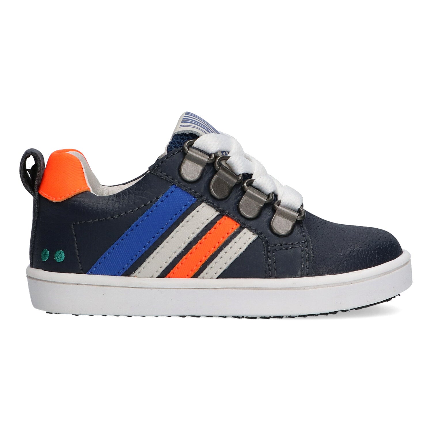 De sneakers zijn gemaakt van donkerblauw leer en hebben aan de zijkant vier sportieve strepen in oranje, blauw en wit. Dankzij de vetersluiting trek je de schoenen makkelijk aan en uit. De rubberen stootneus beschermt de schoenneus tegen beschadigingen — ideaal voor actieve kinderen.