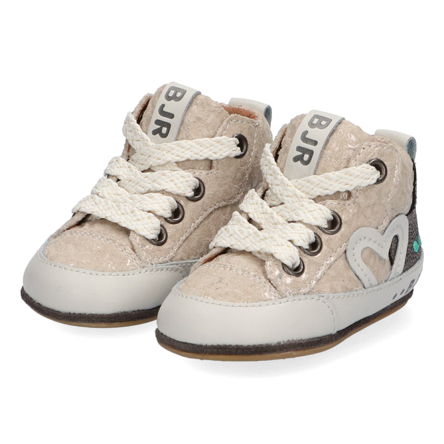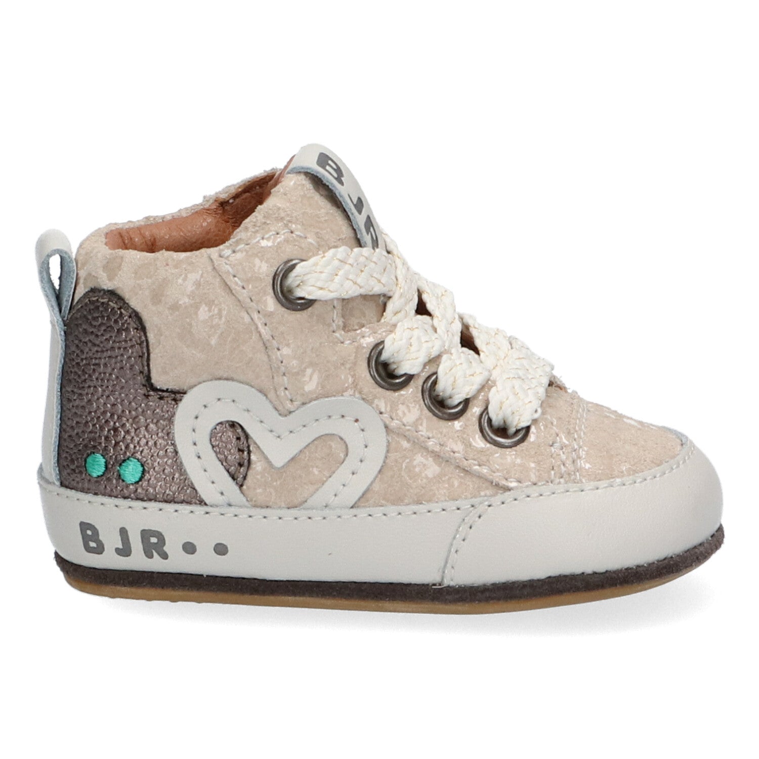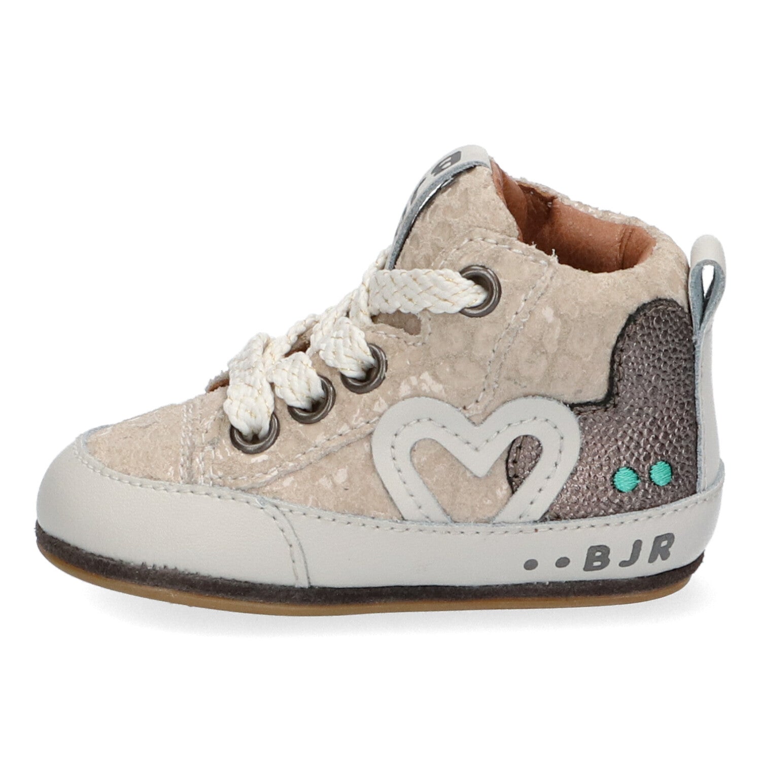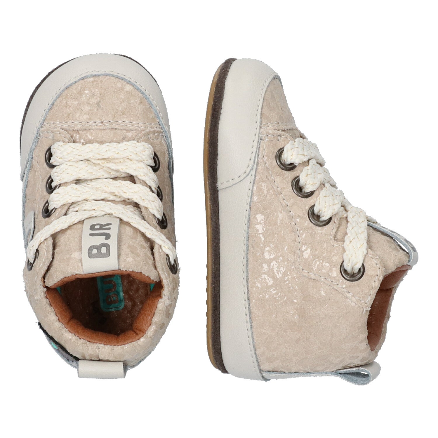 De babyschoentjes van suède zijn crèmekleurig en hebben een glanzende panterprint. Op de zijden hebben de schoentjes twee hartjes en daaronder een BJR-opdruk. Door de veters is een goudkleurige draad gewoven. Hiermee trek je de schoentjes gemakkelijk aan bij je kleintje en zorg je ervoor dat ze goed vast zitten.